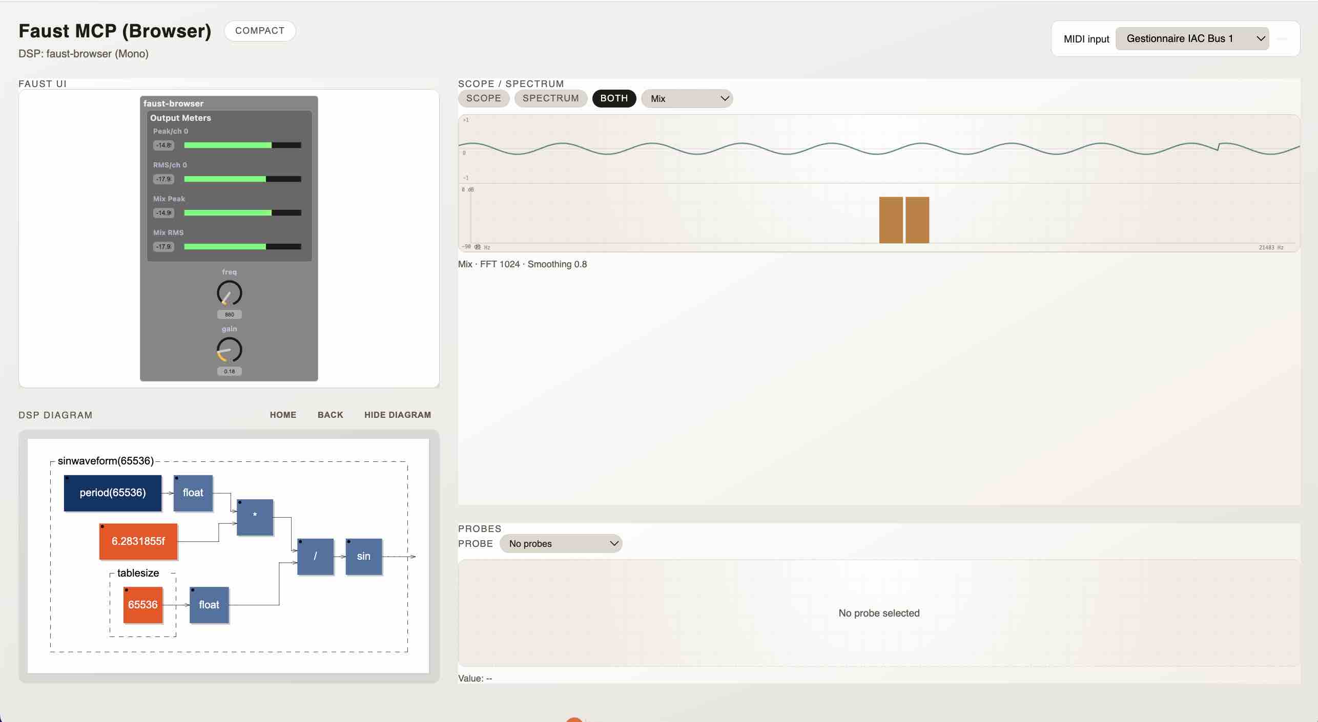 faustbrowser-mcp is a browser-first MCP server for Faust DSP. It runs a tiny Python MCP proxy locally, serves a static browser UI, and delegates all audio/MIDI compilation and playback to the browser runtime. This lets MCP clients control Faust DSP without any native audio runtime on the server side. When connected to the Claude Desktop LLM, it enables a powerful plan / act / observe / refine workflow for programming and iterating on Faust DSP code.